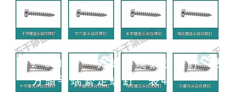 1、Flat:平頭 (鎖入后,頂部與工作件齊平)2、Oval:色拉頭、O頭、半沉頭 3、Round:圓頭 4、Pan:圓扁頭 5、Truss:大圓扁頭 6、Hex:六角頭 A-5:Finish Code/外觀處理。公制自攻螺絲 :于品名后方直接標示 Tapp 不銹鋼螺絲產品主要有:外六角螺栓、圓柱頭內六角螺釘(杯頭)、內六角凹端緊定螺釘(凹端機米)、內六角平端緊定螺釘(平端機米)、內六角尖端緊定螺釘(尖端機米)、內六角柱端緊定螺釘(柱端機米)、沉頭內六角螺釘(平杯)