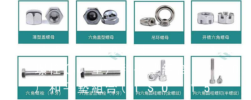 螺栓類:外六角螺栓、外六角法蘭面螺栓、內六角圓柱頭螺栓、吊環螺栓、膨脹螺栓、沉頭內六角螺栓、盤頭內六角螺絲、馬車螺栓、雙頭螺栓、蝶型螺絲、活節螺栓、地腳螺 栓、U型螺栓、四角螺栓等 螺帽類:鉚螺母、吊環螺母、